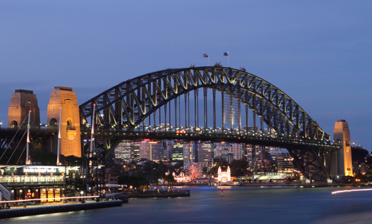 4.【悉尼海港大橋】(遠眺):在澳大利亞悉尼的杰克遜海港,有一座號稱世界第一單孔拱橋的宏偉大橋,這就是著名的悉尼海港大橋。它像一道橫貫海灣的長虹,巍峨俊秀,氣勢磅礴,與舉世聞名的悉尼歌劇院隔海相望,成為悉尼的象征。