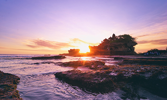 【海神廟 Tanah Lot】(約 30 分鐘)座落于海邊的一塊巨巖上 ,是巴厘島最著名的寺廟之一 ,海水碧藍 ,水波中閃耀著金 黃的光彩 ,此情此景 ,是許多攝影家的最愛。每當潮漲之時 ,巖石被水包圍 ,整座寺廟與陸地隔絕 ,激起的水花沖向廟頂, 場景極為壯麗。