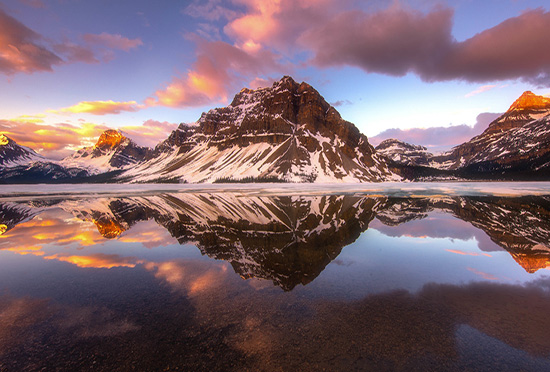 隨后前往【哥倫比亞冰原】 ,沿途眺望【鴉爪冰川Crowfoot Glacier】 ,先游覽【弓湖Bow Lake】(20分鐘) ,落基山脈的輪廓清晰倒映在湖面上。