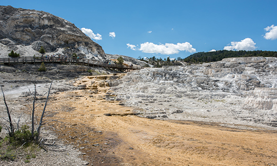 【泥火山】景區(qū)位于黃石湖的北面, 是園區(qū)東部唯一的地?zé)峋皡^(qū)。雖然不大,但是 很有特色:這里大多是泥漿泉,幾乎看不到彩色噴泉。第一個(gè)景點(diǎn)是“泥漿鍋“(Mud Caldron), 離入口很近,一片冒煙的稀泥池。另一處是泥間歇泉(Mud Geyser),很早前就是一個(gè)景色多變的 噴泉,有時(shí)沸騰,有時(shí)寧?kù)o的像一個(gè)溫泉池,沒(méi)有一點(diǎn)“泥”的樣子,遠(yuǎn)處森林間的藍(lán)色水域是著名的黃石河。