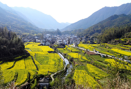 月亮灣是去李坑的路上路過的一個(gè)小島,無需門票,多是攝影愛好者前來采風(fēng)。清晨五點(diǎn)左右來俯瞰月亮灣是最美的,因?yàn)槟菚r(shí)晨霧籠于水面上,白墻、黑瓦、金花、綠水在一片朦朧中更加亦幻亦真,宛如一張中國水墨山水畫。