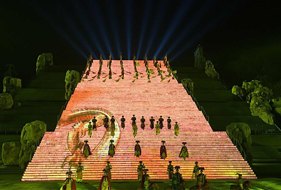 演出以泰山歷史文化為核心,以泰山自然山水為背景,充分展示泰山文化的獨特價值與精深內涵。《中華泰山 封禪大典》就是以泰山文化為創作素材,通過秦、漢、唐、宋、清五朝皇帝登山封禪的歷史背景為創作主線,表現了華夏民族敬畏天地的精神導向,弘揚和歌頌了中國歷史文化上所呈現的“天人合一”精神。