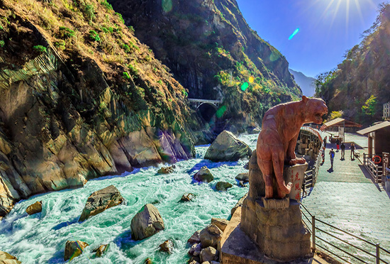 虎跳峽,以“險”而聞名天下。這里首先是山險。峽谷兩岸,高山聳峙。東有玉龍山,終年披云戴雪,銀峰插天,主峰海拔高達5596米,山腰怪石镲峨,古藤盤結,山腳壁立,直插江底,虎嘯猿啼,狼豹出沒;西有哈巴雪山,崢嶸突冗,山腰間有臺地,山腳為陡峻懸崖。西岸山峰,高出江面3000米以上。國內三峽,世稱壯觀,它的江面與峰頂高差,僅1500米;美國的地獄峽谷,世界著名,最大高差,也僅2400米,它的深邃,可以想見!虎跳峽不僅深,而且窄,許多地方,雙峰欲合,如門半開;身入谷中,看天一條縫,看江一條龍;頭頂絕壁,腳臨激流,令人心驚膽戰。其次是水險,由于山巖的斷層塌陷,造成無數石梁跌坎,加之兩岸山坡陡峻,巖石壁立,山石風化,巨石?!け浪鹊?,形成江中礁石林立,犬牙交錯,險灘密布,飛瀑薈萃。從上虎跳峽至下峽口,落差達210米,平均每公里14米,江流特急,不少段落,每秒達六至八米。因而江水態勢,瞬息萬變,或狂馳怒號,石亂水激,雪浪翻飛,或旋渦漫卷,飛瀑轟鳴,霧氣空蒙。構成世上罕見的山水奇觀。