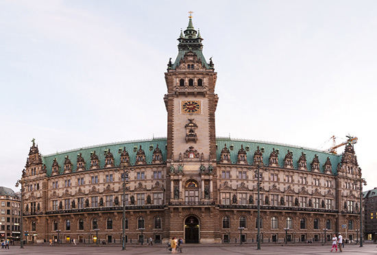 ?市政廳建于1886年,是19世紀后半期建成的新巴洛克式風格的建筑物,建筑上裝飾著不少富有紀念意義和象征作用的藝術品。市政廳外觀整個大廈用砂巖砌成,整體呈煙灰色,屋頂為銅綠色,呈現古樸的風格。大樓中央的尖塔高112米,是漢堡最醒目的建筑之一。塔上裝飾著金色的帝國之鷹,這是德意志統一的標志。市政廳內部市政廳大樓有4層,內部房間非常多,有647件。一層大廳有兩排石柱,共16根,每根柱子上都有人像浮雕,這些人像則是德國著名的人物,例如戲劇家萊辛,音樂家勃拉姆斯和物理學家赫茲等。市政宴會和接待大廳懸掛的畫像描述了漢堡的發展史。在市長廳內保存著漢薩同盟的“金冊”,銅牌上鐫刻著1264-1912年漢堡歷屆市長的名字。而二樓各窗之間豎立著20位德意志著名帝王的塑像。