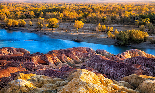五彩灘位于新疆布爾津縣城西北24公里處的額爾齊斯河北岸,是一個以雅丹地貌著稱的河灘。這里的丘陵地質奇特,顯示出多種色彩,每到傍晚夕陽照耀時,顏色絢爛奇幻,非常壯觀。對岸是一片茂密的胡楊林,倒映在河水中景色優美,這里一到秋天,就美成了童話。黃葉燦爛,是拍照攝影的好去處。五彩灘景區的面積不大,縱深1公里左右,景區里修有多條棧道和觀景臺,沿著棧道一路步行觀賞即可,一般游玩時間在2個小時左右,若是攝影愛好者則需要更久。游玩五彩灘景區一般從布爾津縣而來,游玩時間為傍晚日落之前,這里由于干燥且地勢平坦,傍晚時常出現長時間金黃色或者紅色的夕陽,照耀在五彩地貌上非常美麗。景區的大門在河岸的東側,從這里進入景區。進入后首先會看到一座廣場,廣場上有一些雕塑、工藝品商店和餐廳等建筑,旁邊還有一些賣羊肉串等食品的小店,這里的食物比外面稍貴一些,不過價格還算可以接受,有需要的話可以簡餐一下。