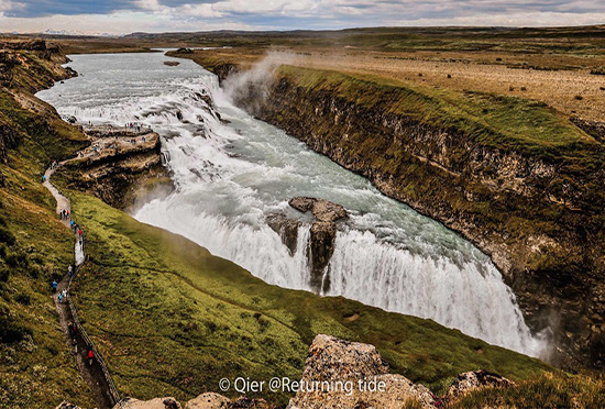 作為游覽冰島的必游景點之一,黃金瀑布有當仁不讓的理由。河流從32米的高處飛流直下,分為兩級,上級落差11米,下級落差21米,寬100多米。遠遠看去就好像兩條彩虹,沿著大裂谷奔流而去,場面十分的壯觀,因水流湍急,看似金黃色,故得名。如果在一場大雨后,還會看到大大的彩虹橫跨在瀑布上。