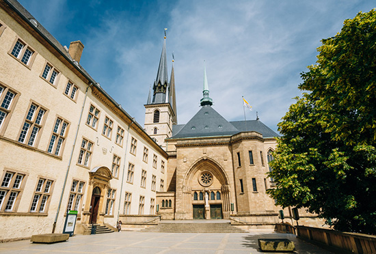 圣母教堂坐落在盧森堡城市的中心,建于1613年至1621年之間。該教堂原是教會學(xué)校,1935年擴(kuò)建工程之后,三個尖頂?shù)拿弊颖患由先?,成為了圣母堂,?nèi)部供奉的是圣母瑪麗亞。教堂北部門的結(jié)構(gòu)是文藝復(fù)興時期藝術(shù)風(fēng)格與巴洛克式風(fēng)格相結(jié)合的產(chǎn)物。教堂內(nèi)部金碧輝煌,裝飾有精美的巴洛克管風(fēng)琴臺和皇家式的巨大拱頂,內(nèi)壇飾以名貴的雪花石膏雕像,墻柱上雕刻著阿拉式圖像。據(jù)說地下室里還有當(dāng)年皇家的墳?zāi)埂C磕陱?fù)活節(jié)后的第五個星期,盧森堡數(shù)以千計的朝者匯集于此,舉行隆重的朝圣典禮。同時這里也是皇家舉行典禮和儀式的地方,當(dāng)年盧森堡國王和比利時公主曾在此舉行過盛大的結(jié)婚儀式。