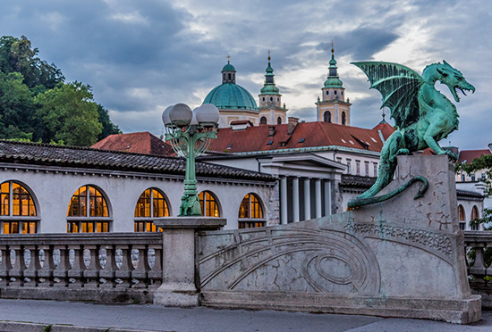 龍橋建于1901年,橫跨在盧布爾雅那河上,來回走一圈不過5分鐘,但它是盧布爾雅那的標志建筑。龍橋最精彩的裝飾就是兩端橋頭雕塑的四只青銅翼龍了,整個造型就是西方卡通故事中張牙舞爪、口中噴火的形象,而街邊小店里出售的公仔、T恤、明信片大都是它的形象,如今這個形象幾乎代表了盧布爾雅那。