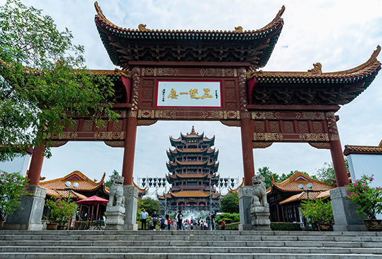 黃鶴樓位于武漢市蛇山的黃鶴磯頭,面對鸚鵡洲,與湖南岳陽樓、江西滕王閣、山東蓬萊閣合稱中國四大名樓。相傳始建于三國時期,歷代屢毀屢建?,F樓為1981年重建,以清代“同治樓”為原型設計。樓址仍在蛇山頭。主樓高49米,共五層,攢尖頂,層層飛檐,四望如一。底層外檐柱對徑為30米,中部大廳正面墻上設大片浮雕,表現出了歷代有關黃鶴樓的神話傳說;三層設夾層回廊,陳列有關詩詞書畫;二、三、四層外有四面回廊,可供游人遠眺;五層為瞭望廳,可在此觀賞大江景色;附屬建筑有仙棗亭、石照亭、黃鶴歸來小景等.黃鶴樓是聞名中外的名勝古跡,它雄踞長江之濱,蛇山之首,背倚萬戶林立的武昌城,面臨洶涌浩蕩的揚子江,相對古雅清俊晴川閣,剛好位于長江和京廣線的交叉處,即東西水路與南北陸路的交匯點上。登上黃鶴樓武漢三鎮的旖旎風光歷歷在目,遼闊神州的錦繡山河也遙遙在望。由于這獨特的地理位置,以及前人流傳至今的詩詞、文賦、楹聯、匾額、摩巖石刻和民間故事,使黃鶴樓成為山川與人文景觀相互倚重的文化名素來享有美譽。黃鶴樓在湖北武昌長江南岸,相傳也始建于三國,唐時名聲始盛,這主要得之于詩人崔顥"昔人已乘黃鶴去,此地空余黃鶴樓"詩句。宋畫《黃鶴樓圖》再現了宋樓的面貌。圖中黃鶴樓建在城臺上,臺下綠樹成蔭,遠望煙波浩淼。中央主樓兩層,平面方形,下層左右伸出,前后出廊屋與配樓相通。全體屋頂錯落,翼角嶙峋,氣勢雄壯。宋以后,黃鶴樓曾屢毀屢建,清同治七年(1868)重建,但只存在了十幾年。現僅留當時樓貌照片,已不是宋畫在高臺上叢建多座建筑,而取集中式平面,高踞在城垣之上,平面為折角十字,外觀高三層,內部實為六層。下、中二檐有12個高高翹起的屋角,總高32米。黃鶴樓坐落在海拔高度61.7米蛇山頂,以清代“同治樓”為原型設計。樓高5層,總高度51.4米,建筑面積3219平方米。72根圓柱拔地而起,雄渾穩健;60個翹角凌空舒展,恰似黃鶴騰飛。樓的屋面用10多萬塊黃色琉璃瓦覆蓋。在藍天白云的映襯下,黃鶴樓色彩絢麗,雄奇多姿。黃鶴樓的形制自創建以來,各朝皆不相同,但都顯得高古雄渾,極富個性。與岳陽樓、滕王閣相比,黃鶴樓的平面設計為四邊套八邊形,謂之“四面八方”。這些數字透露出古建筑文化中數目的象征和倫理表意功能。從樓的縱向看各層排檐與樓名直接有關,形如黃鶴,展翅欲飛。整座樓的雄渾之中又不失精巧,富于變化的韻味和美感。
