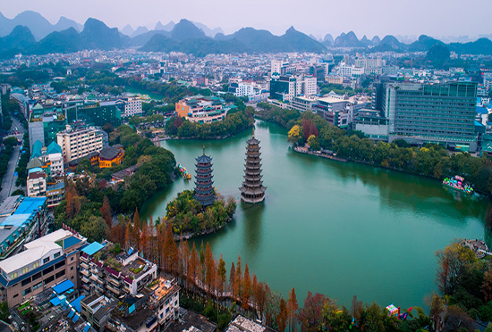 漓江、桃花江、木龍湖、桂湖、榕湖、杉湖謂之兩江四湖。桂、杉、榕三湖宋已有之,今之木龍湖為陸地。為溝通漓江與內湖之水脈,掘土45萬余方,乃成。因與漓江之交匯處有木龍古渡之勝景,其上木龍洞在焉,故曰木龍湖。兩江四湖景區遍植名樹、名花、名草,造榕樹、銀杏、雪松、水杉、木蘭、棕櫚諸園,以改善桂林中心城之生態;架設名橋19座,以增加江湖之靈氣;恢復、修建古之名樓、名塔、名亭萬余平方米,以增加桂林城市之亮點;發掘、修繕文物50余處,以昭然桂林之歷史文化;建高科技之升船機、船閘各一處,以方便舟船之通行。桂林的水上游覽興于唐代、盛于宋代,當時的桂林城湖塘密布,水系發達,乘一葉小舟就可盡覽城中諸多風景名勝,但是隨著歷史變遷,江湖隔斷,水上游覽隨之衰落。如今伴隨著兩江四湖游的發展,桂林城的水上游覽又將恢復昔日的興盛,必將成為桂林又一條黃金水道,歡迎中外游客舟行兩江四湖,飽覽水上桂林,感受“東方的威尼斯”。