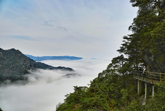 索道有上中下三站,其中,中站是一個一百多度的大轉彎,略感驚險,過了中站便能看到杜鵑山的輪廓了。由索道上站開始步行,20分鐘左右走到古柏峰的三岔路,這里是杜鵑山觀光的起點和終點。左手一條羊腸小道只有在專業向導帶領下才能進去,右手兩條步道,一條是懸空棧道,一條是木質游步道,二者在東面的大小松島附近連成一個環形。游人通常會往左邊的懸空棧道開始順時針游覽。路很好走,可邊走邊欣賞沿途的風景。